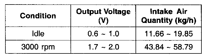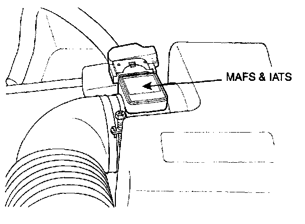 The Mass Air Flow Sensor (MAFS) is located between the air cleaner assembly and the throttle body. The MAFS uses a hot turn type sensing element to measure the mass of intake air entering the engine. Mass air flow rate is measured by detecting of heat transfer from a hot film probe. The change in air flow rate causes change in the amount of heat being transferred from the hot film probe surface to the air. A large amount of intake air represents acceleration or high load conditions while a small amount of intake air represents deceleration or idle. The ECM uses this information to determine the injection duration and ignition timing for the desired air/fuel ratio.