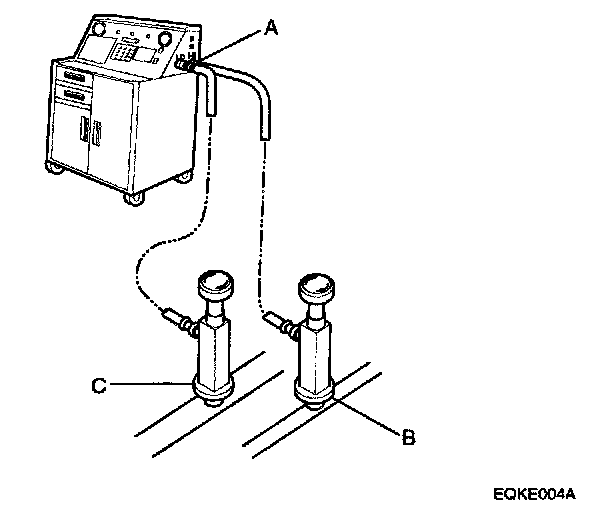 1. Connect a R-134a refrigerant recover/recycling/charging station(A) to the high-pressure service port(B) and the low-pressure service port(C), as shown, following the equipment manufacture s instructions.