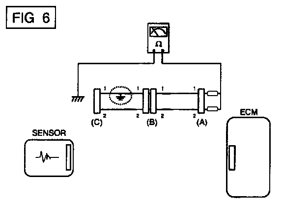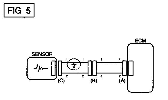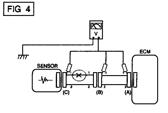 a. With each connector still connected, measure the voltage between the chassis ground and terminal 1 of each connectors (A), (B) and (C) as shown in [FIG. 4].