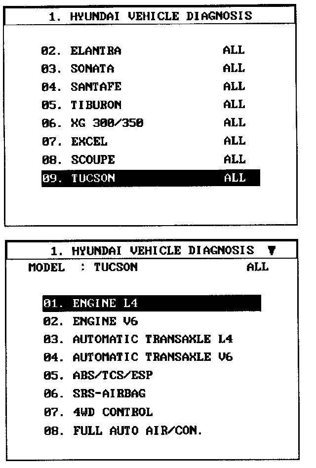 1. Select "Vehicle" and "Engine" (For example, TUCSON 2.0L L4).