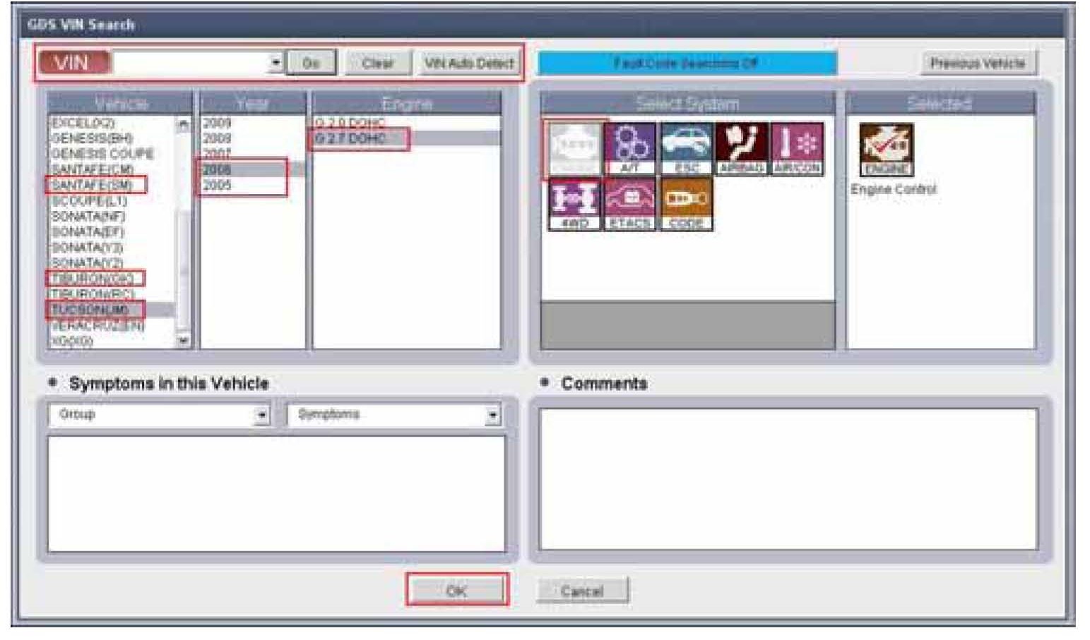 2. Enter the vehicle information by pressing the VIN Auto Detect button, entering the vehicle's VIN or selecting the vehicle model, model year, engine/fuel type and ENGINE as the system and then click OK.