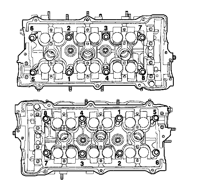 Install and uniformly tighten the cylinder head bolts on each cylinder head in several passes and in the sequence shown, then repeat for the other side, as shown.