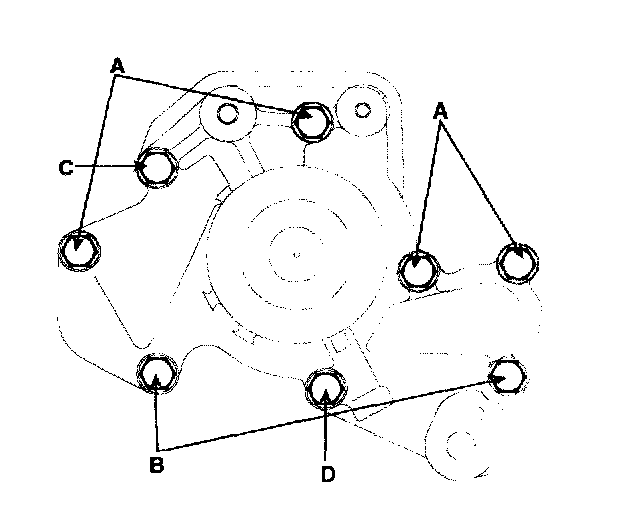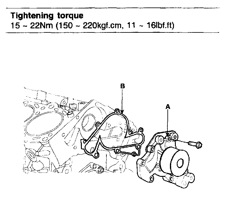 1. Install the water pump (A) and a new gasket (B) with the 8 bolts.