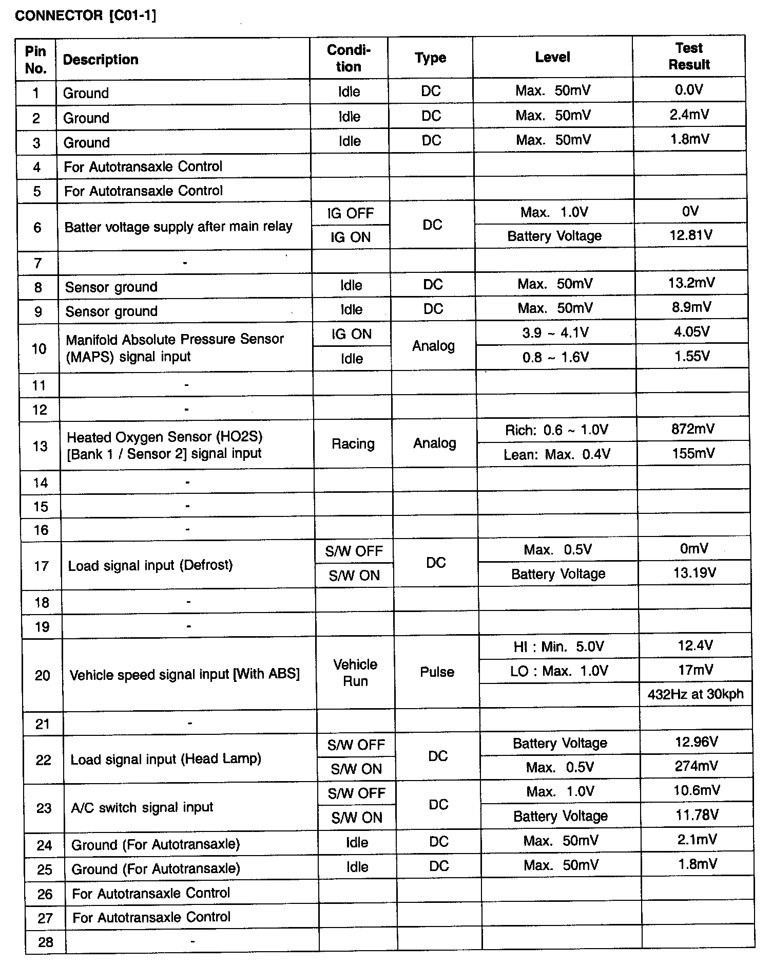 PCM Terminal In/Out Signal - Connector (C01-1) Part 2: