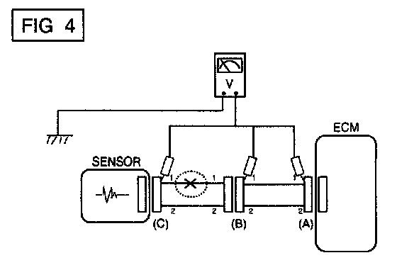 a. With each connector still connected, measure the voltage between the chassis ground and terminal 1 of each connectors and (C) as shown in [FIG. 4].