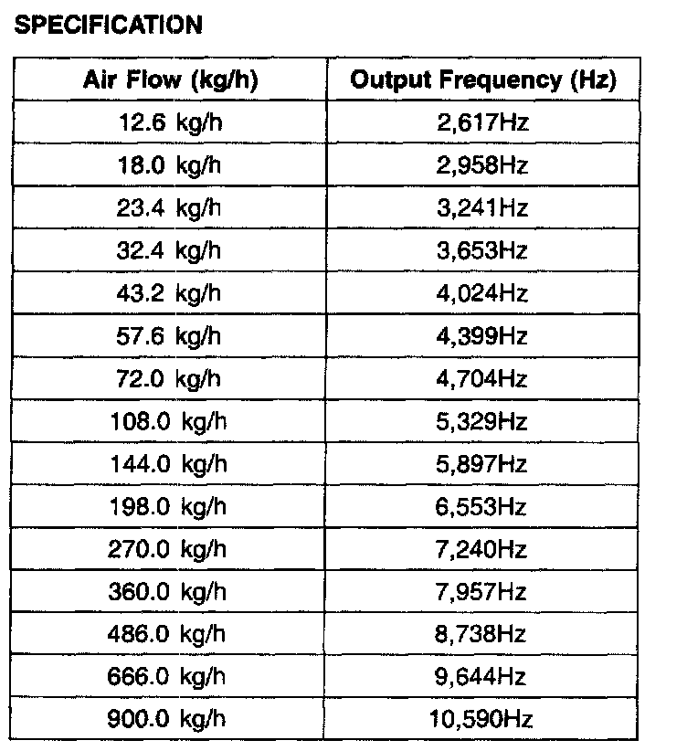 Mass Air Flow Sensor (MAFS) is a hot-film type sensor and is located in between the air cleaner and the throttle body. It consists of a tube, a sensor assembly and honey cell and detects intake air quantity flowing into the intake manifold. While the intake air coming out of the air cleaner flows by the honey cell, it becomes laminar flow, and then it passes the hot-film. At this time, heat transfer is generated by convection and this sensor loses its energy. This sensor detects the mass air flow by using the energy loss and transfers the information to the PCM by frequency. The PCM calculates fuel quantity and ignition timing.