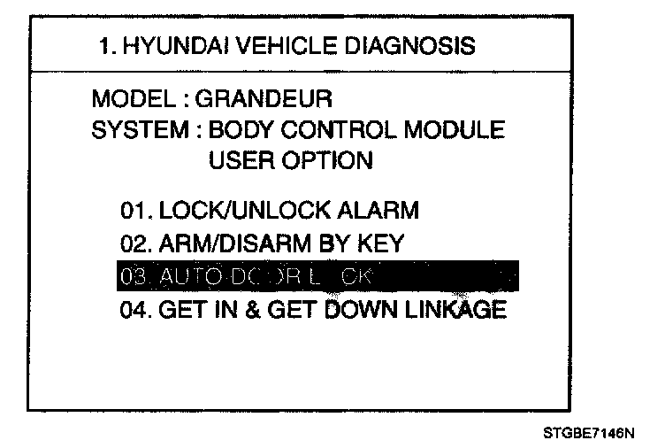 The BCM offers 4 items user option mode for a user convenience (LOCK/UNLOCK ALARM, AUTO DOOR LOCK, GET IN & GET DOWN LINKAGE, ARM/DISARM BY KEY)
