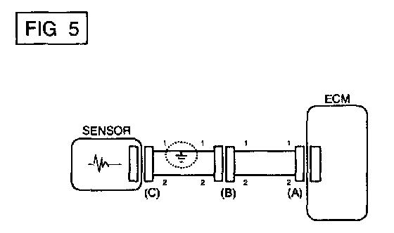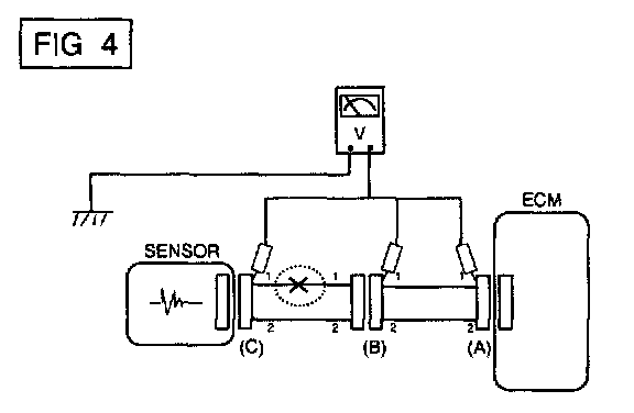 a. With each connector still connected, measure the voltage between the chassis ground and terminal 1 of each connectors (A), (B) and (C) as shown in [FIG. 4].