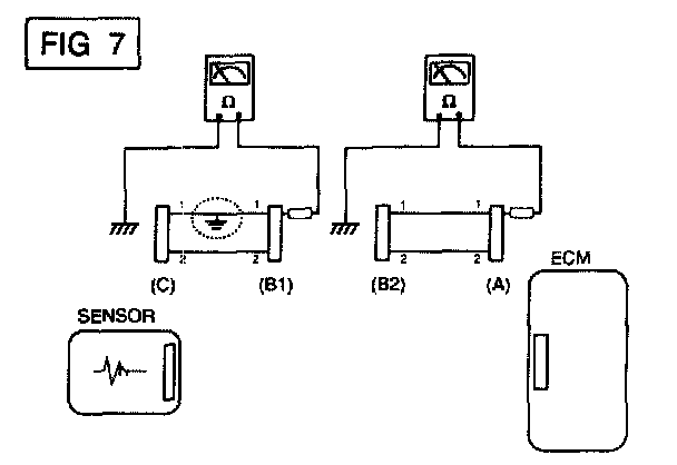 b. Disconnect connector (B), and measure the resistance between connector (A) and chassis ground, and between (B1) and chassis ground as shown in [FIG. 7].