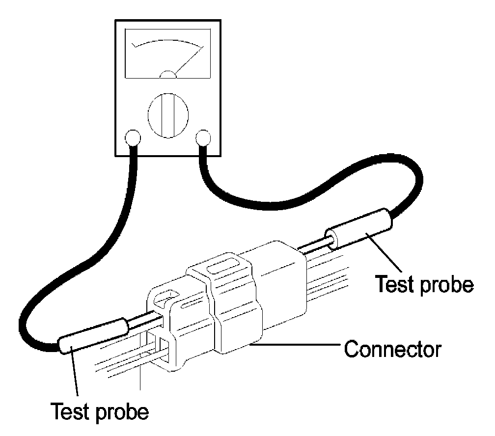 11. When using a circuit tester to check continuity or voltage on connector terminals, insert the test probe into the harness side. If the connector is a sealed connector, insert the test probe through the hole in the rubber cap until contacts the terminal, being careful not to damage the insulation of the wires.