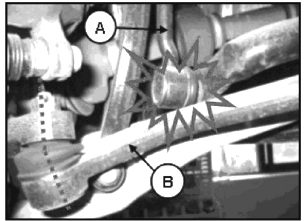 During toe-in adjustment, the tie rod end (B) may move towards the stabilizer bar link (A) and reduce the clearance between the two parts as shown.