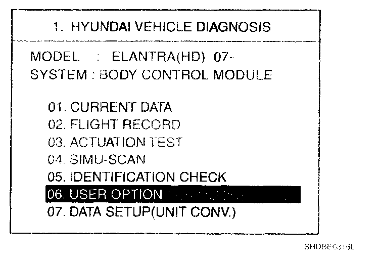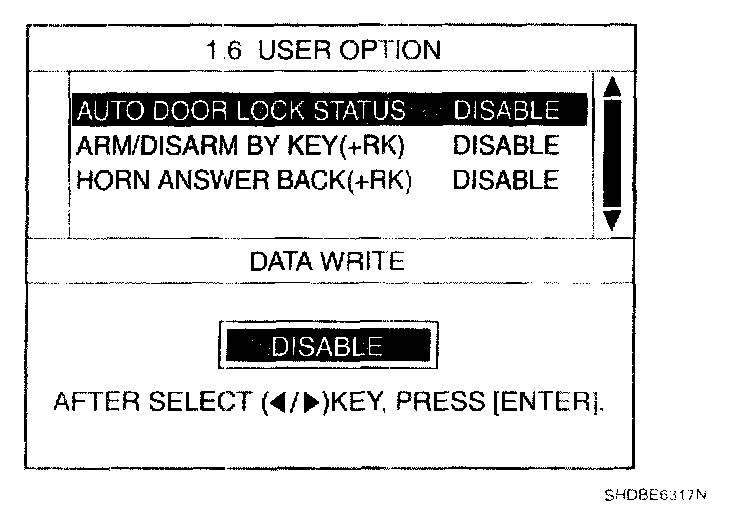 USER OPTION MODEThe BCM offers 4 items user option mode for a user convenience (AUTO DOOR LOCK, ARM/DISARM BY KEY, HORN ANSWER BACK)