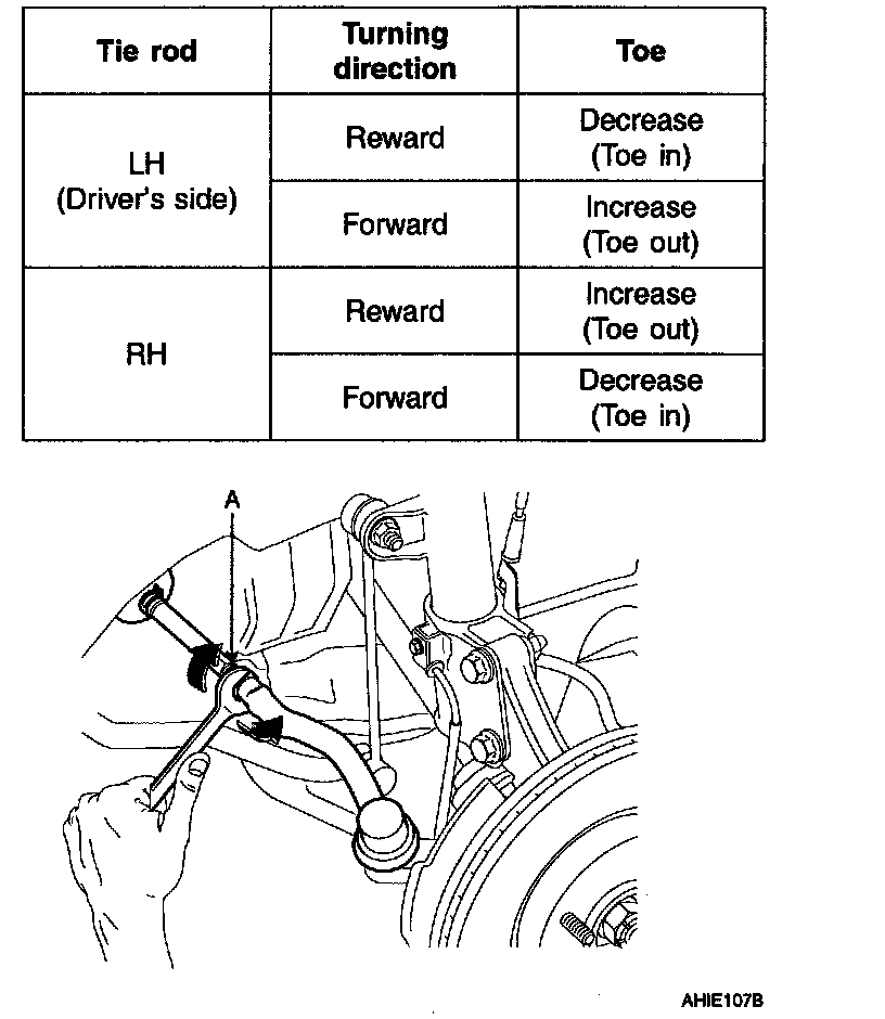 3. Adjust the toe by screwing or unscrewing the tie rod. Toe adjustment should be made by turning the right and left tie rods by the same amount.