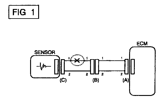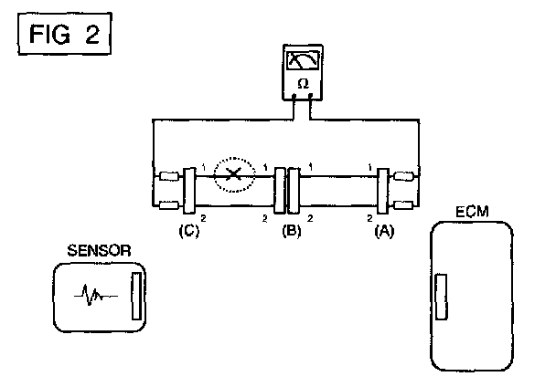 In [FIG.2.] the measured resistance of line 1 and 2 is higher than 1 Mohm and below 1 Ohm respectively. Specifically the open circuit is line 1 (Line 2 is normal). To find exact break point, check sub line of line 1 as described in next step.