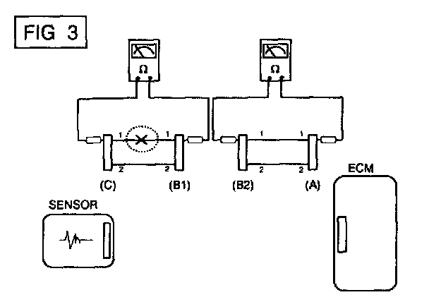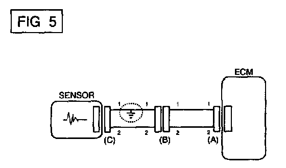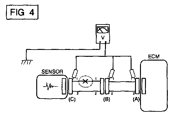 a. With each connector still connected, measure the voltage between the chassis ground and terminal 1 of each connectors (A), (0) and (C) as shown in [FIG. 4].