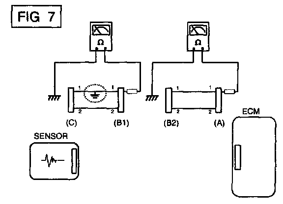 b. Disconnect connector (B), and measure the resistance between connector (A) and chassis ground, and between (B1) and chassis ground as shown in [FIG. 7].
