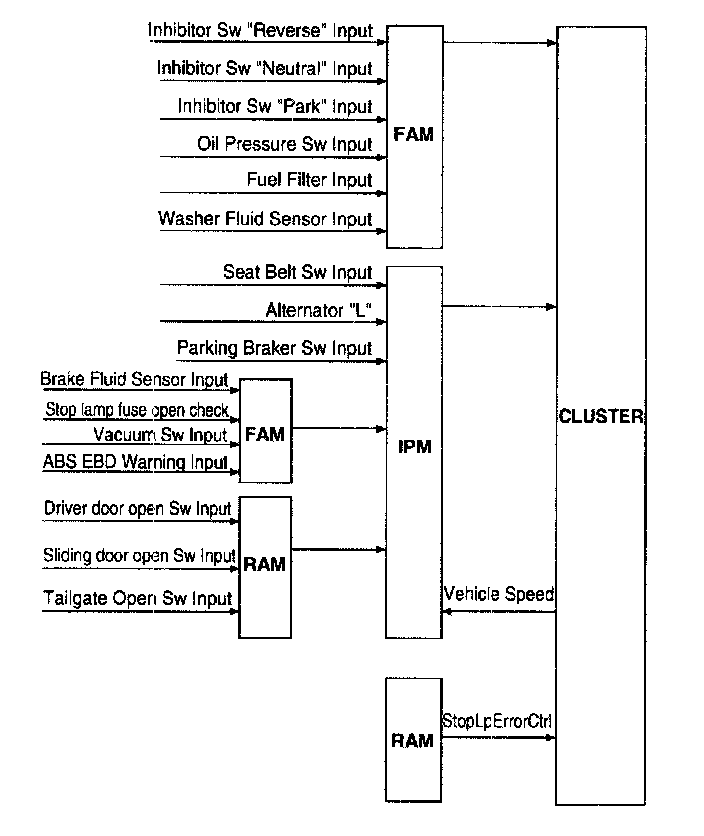 The IPM receives on digital input the status of the parking brake switch and by CAN network the status of the vacuum switch, the status of the ABS EBD warning, the status of the brake fluid sensor and the speed of the vehicle.
