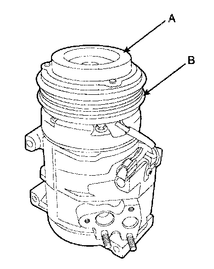 4. Check operation of the magnetic clutch. Connect the compressor side terminals to the battery (+) terminal and the ground battery (-) terminal to the compressor body.