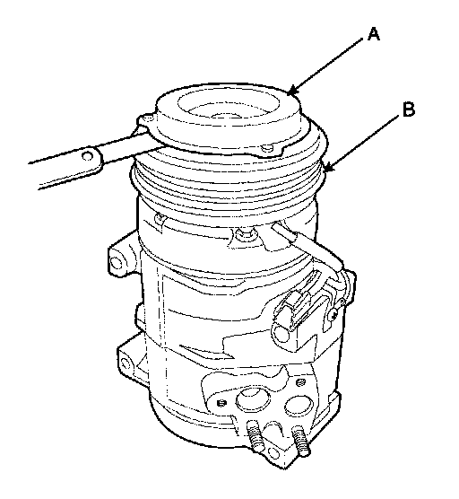 2. Check the pulley (B) bearing play and drag by rotating the pulley by hand. Replace the clutch set with a new one if it is noisy or has excessive play/drag.