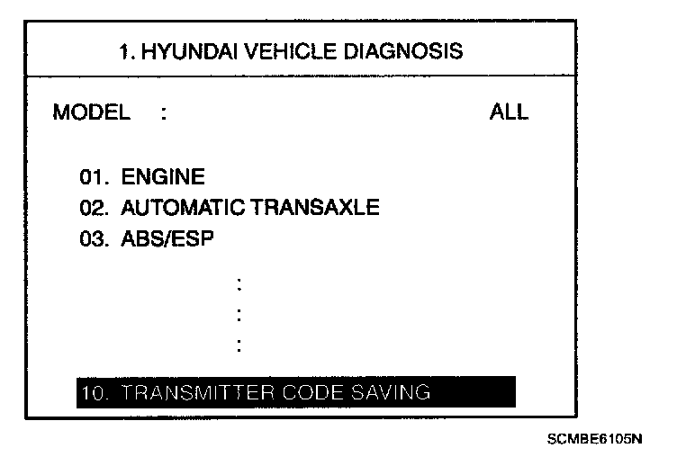 TRANSMITTER CODE REGISTRATION1. Connect the DLC cable of scan tool to the data link connector (16 pins) in driver side crash pad lower panel, turn the power on scan tool.