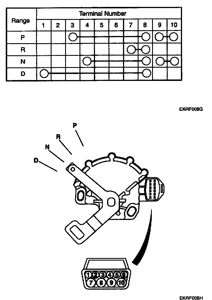 9. If there is not continuity between the terminals in the table above for each switch position, replace the inhibitor switch.