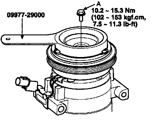DISASSEMBLY1. Remove the center bolt (A) while holding the disc & hub assembly with a commercially available disc & hub assembly bolt remover; Special tool number 09977-29000.