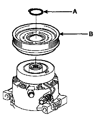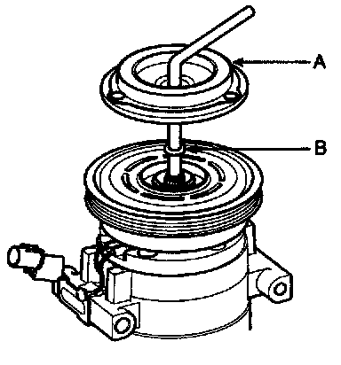 - Be careful not to damage the pulley (B) and compressor during removal/installation.