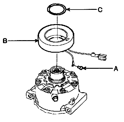 4. Remove the screw (A) from the field coil ground terminal and then remove the field coil (B) and retainer ring (C).