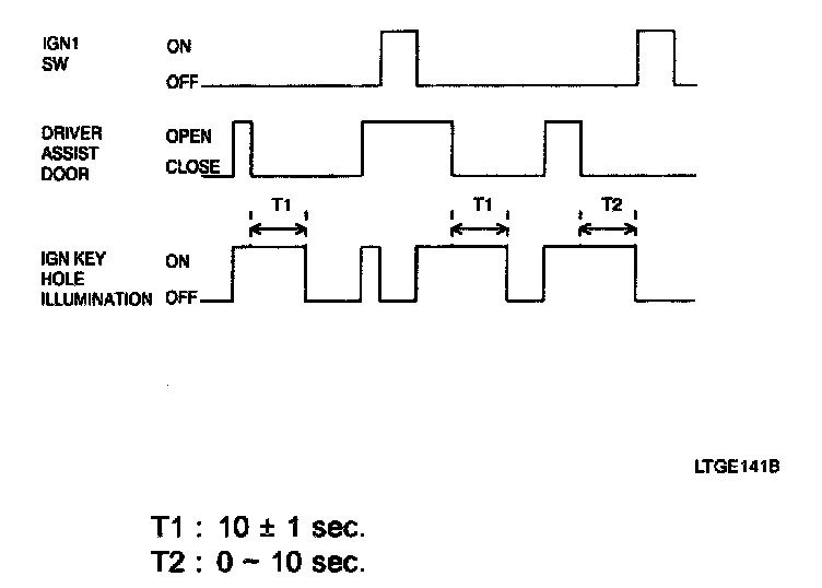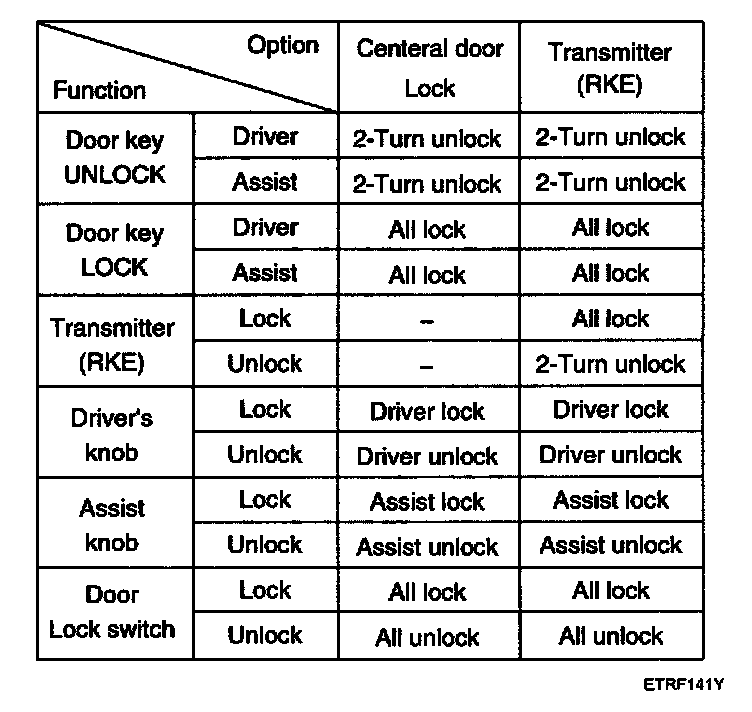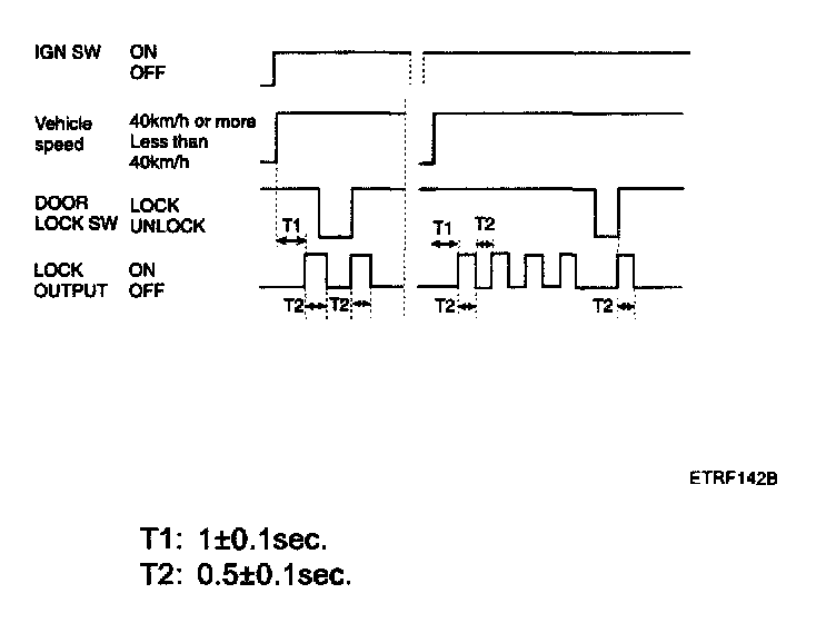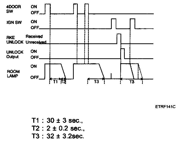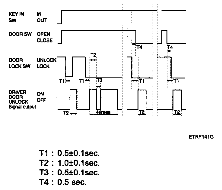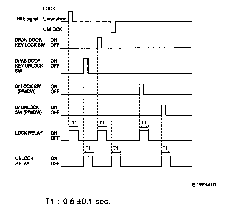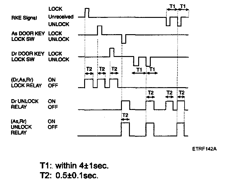 2. Driver door unlock signal is output for T2 when RKE UNLOCK signal is received. But, all door unlock signals are output for T2 if RKE UNLOCK signal is received within T1.