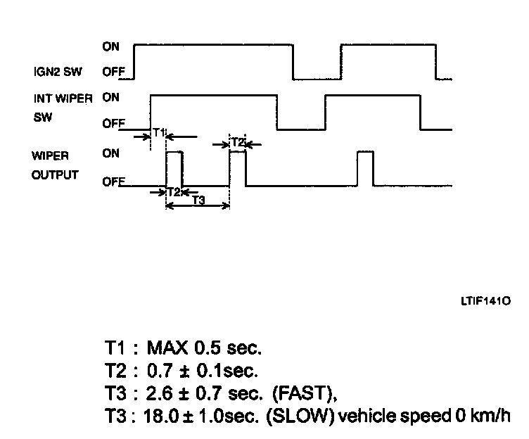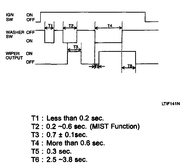 2. If the washer switch is turned OFF within 0.6 sec. (T2), the wiper will remain ON for up to 0.7 sec. (T3) from the moment that washer switch is turned OFF