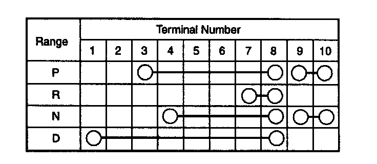 9. If there is not continuity between the terminals in the table above for each switch position, replace the inhibitor switch.