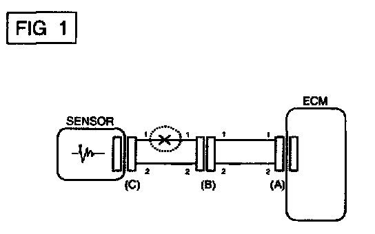 In [FIG.2.] the measured resistance of line 1 and 2 is higher than 1 MOhm and below 1 Ohm respectively. Specifically the open circuit is line 1 (Line 2 is normal). To find exact break point, check sub line of line 1 as described in next step.