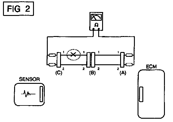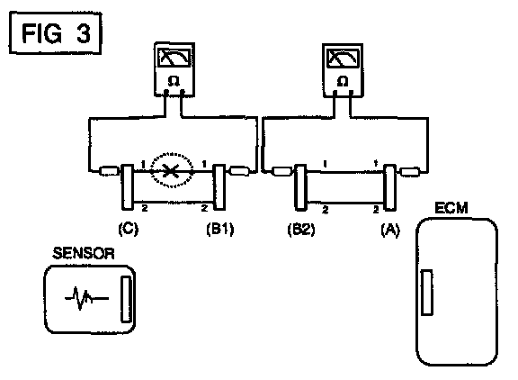 b. Disconnect connector (B), and measure for resistance between connector (C) and (B1). and between (B2) and (A) as shown in [FIG. 3].