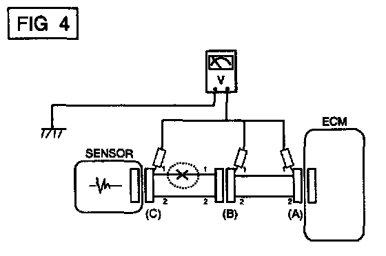 a. With each connector still connected, measure the voltage between the chassis ground and terminal 1 of each connectors (A), (B) and (C) as shown in [FIG. 4].