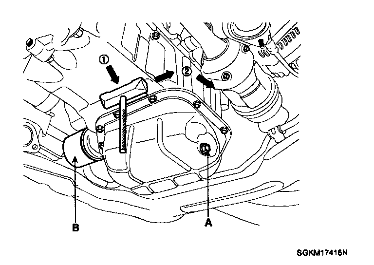 ^ After tapping the SST with a plastic hammer along the direction� arrow around more than 2/3 edge of the oil pan, remove it from the ladder frame.