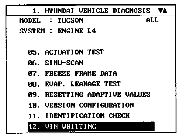 VIN PROGRAMMING PROCEDUREVIN (Vehicle Identification Number) is a number that has the vehicle's information (Maker, Vehicle Type, Vehicle Line/Series, Body Type, Engine Type, Transmission Type, Model Year, Plant Location and so forth. For more information). When replacing an ECM, the VIN must be programmed in the ECM. If there is no VIN in ECM memory, the fault code (DTC P0630) is set.