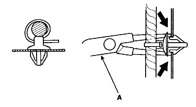 3. Slip pliers (A) under the clip base and through the hole at an angle, then squeeze the expansion tabs to release the clip.