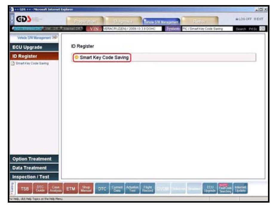 1. Connect the GDS unit to the vehicle and select the vehicle model and PIC (Smart Key Code Saving) option from the VIN screen.