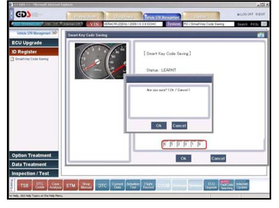 5. Enter the 6 digit PIN code obtained from the Hyundai Dealer website and press OK. You will be prompted twice, asking you if you are sure you want to continue. Press OK at each prompt to continue or press Cancel to exit Smart Key Teaching.