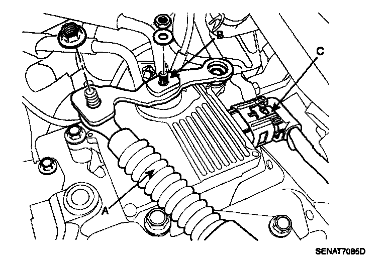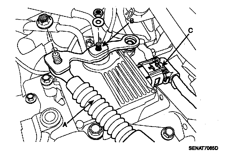 4. Install the shift cable (A), the manual lever (B), and the connector (C).