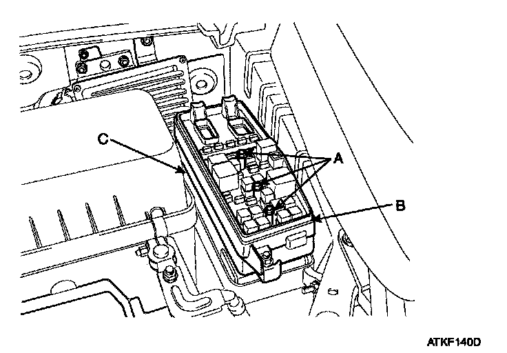 4. Remove the IPM (B) from the splash shield (C) after loosening the 3 IPM mounting bolts (A) and the IPM mounting clip.