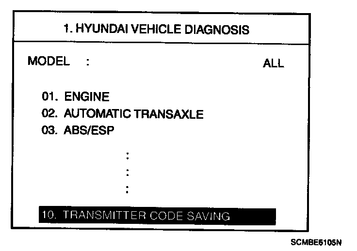TRANSMITTER CODE REGISTRATION1. Connect the DLC cable of scan tool to the data link connector (16 pins) in driver side crash pad lower panel, turn the power on scan tool.