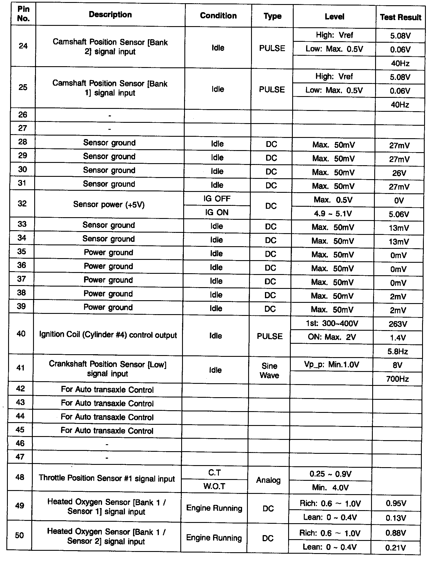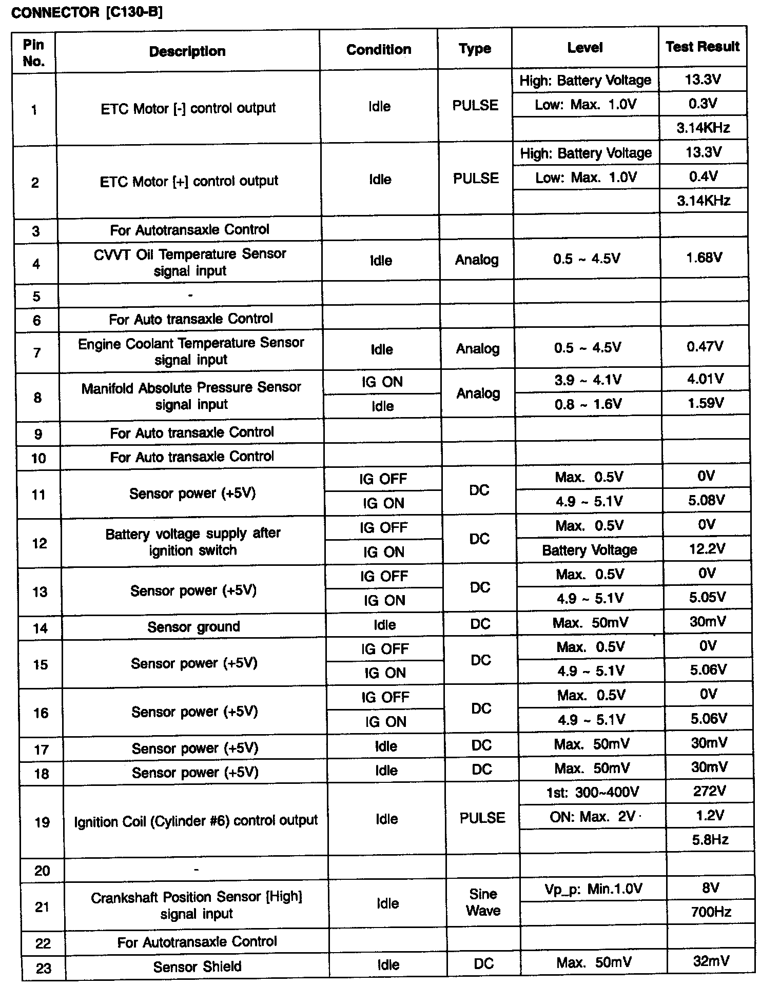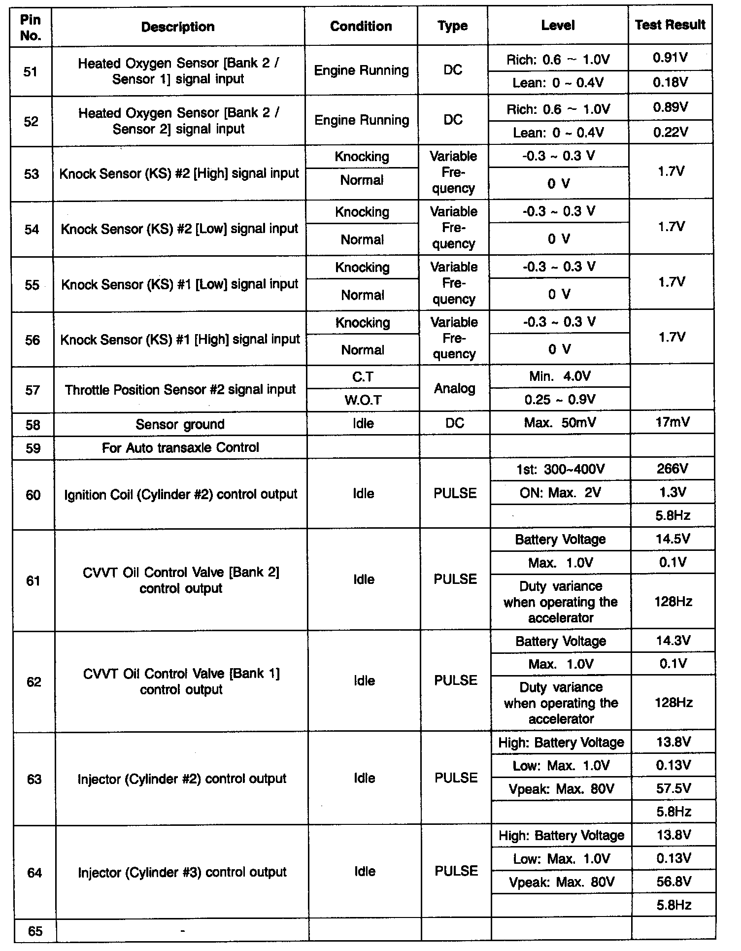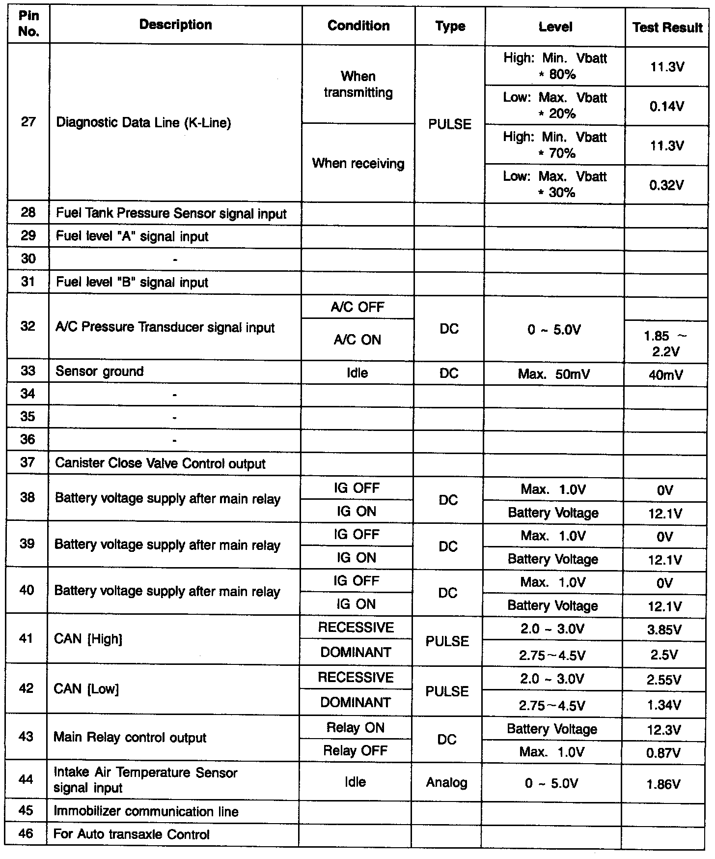 Home >> Hyundai >> 2008 >> Santa Fe FWD V6-3.3L >> Repair and Diagnosis >> Powertrain Management >> Computers and Control Systems >> Engine Control Module >> Testing and Inspection >> Pinout Values and Diagnostic Parameters
