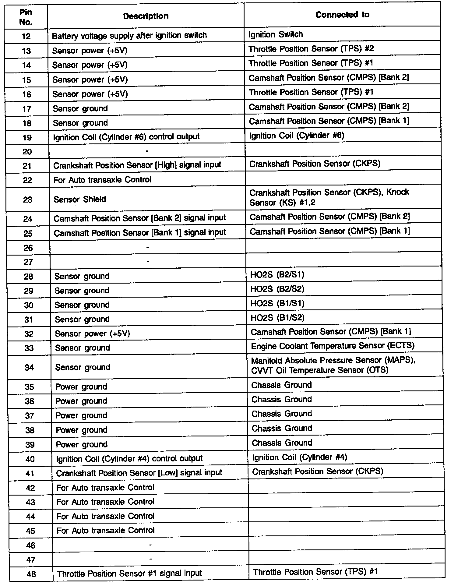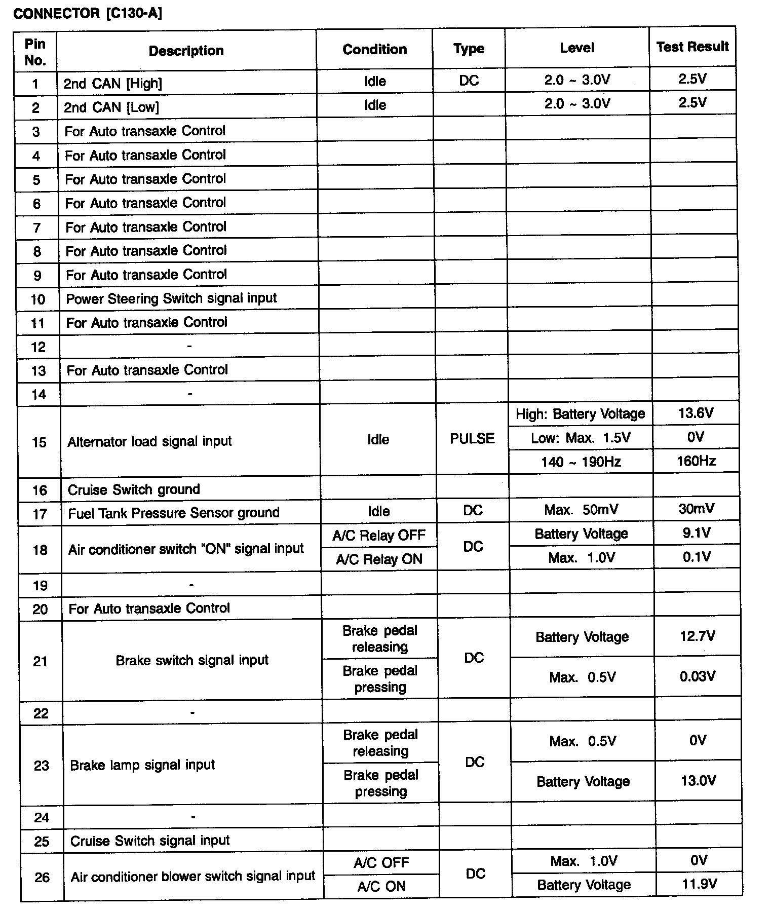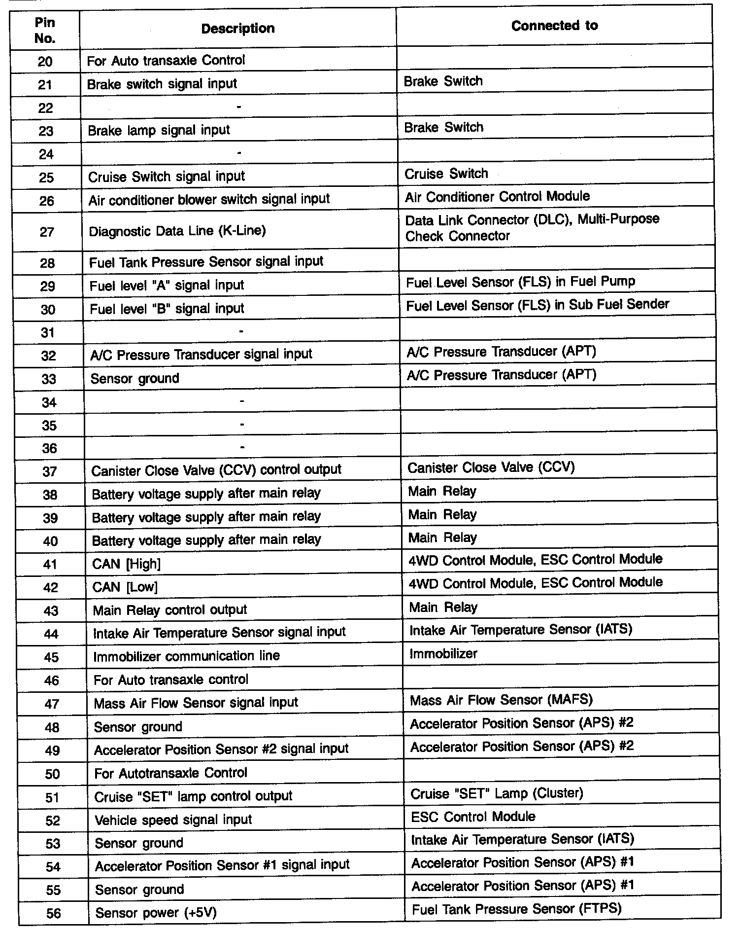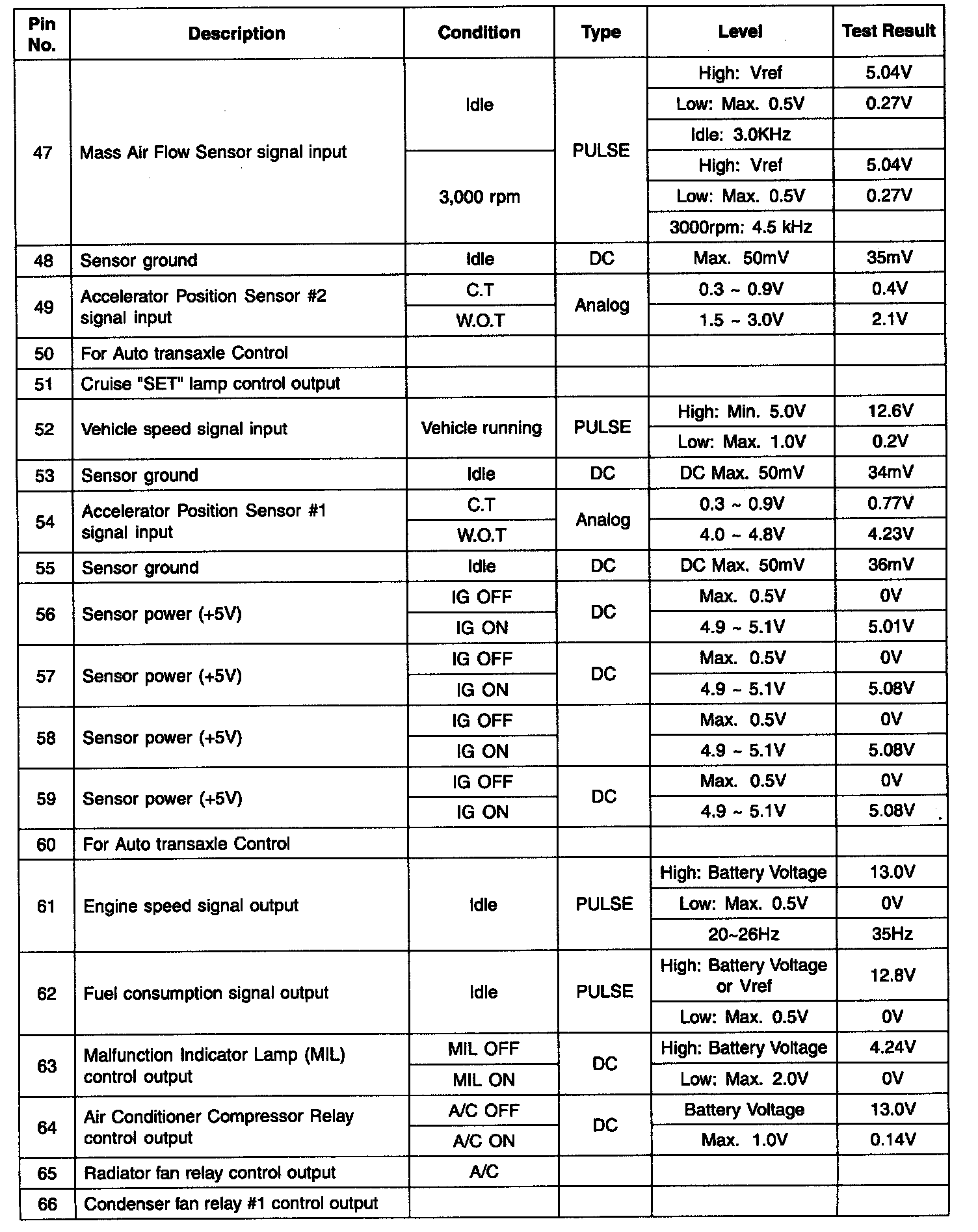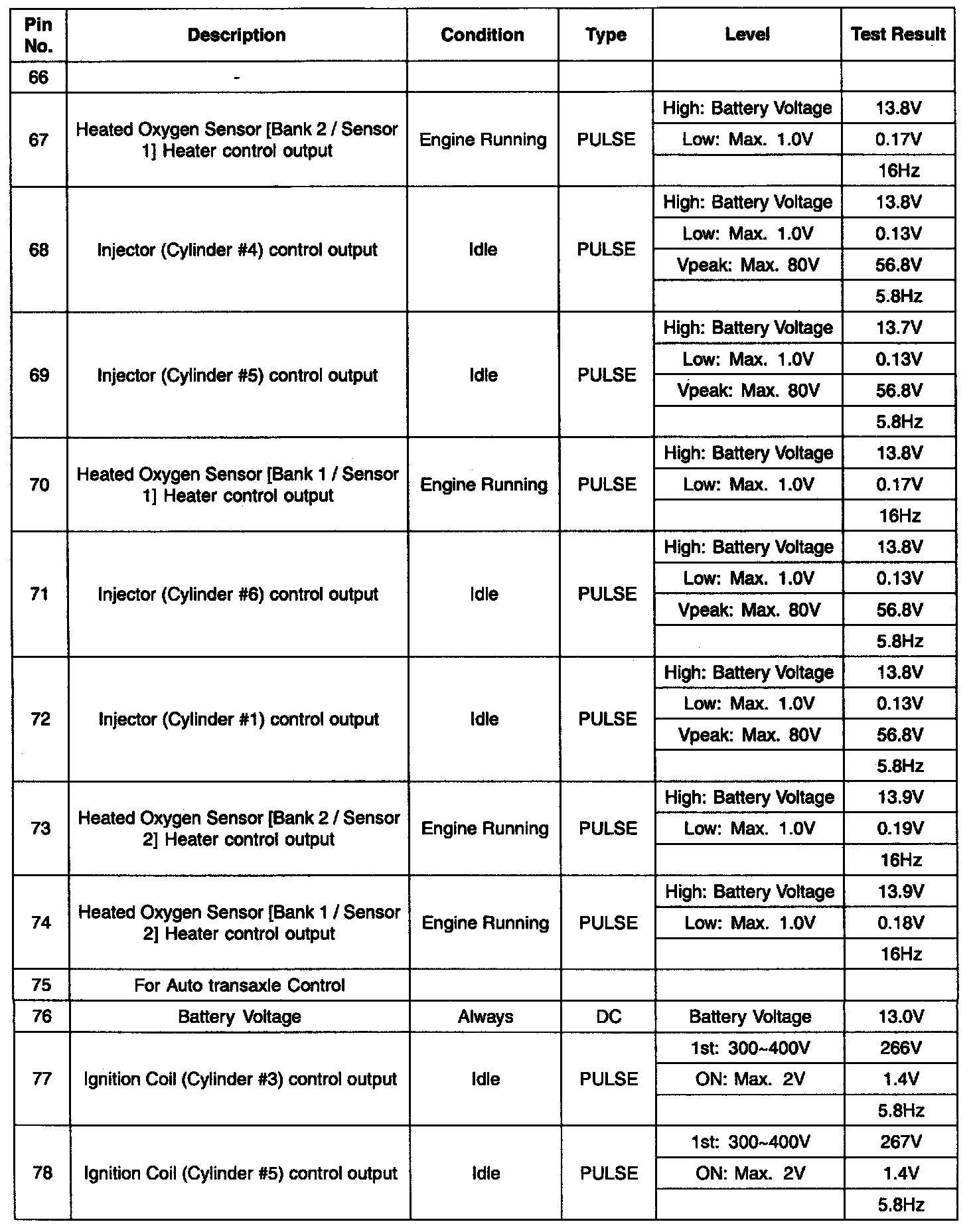 Home >> Hyundai >> 2008 >> Santa Fe FWD V6-3.3L >> Repair and Diagnosis >> Powertrain Management >> Computers and Control Systems >> Engine Control Module >> Testing and Inspection >> Pinout Values and Diagnostic Parameters