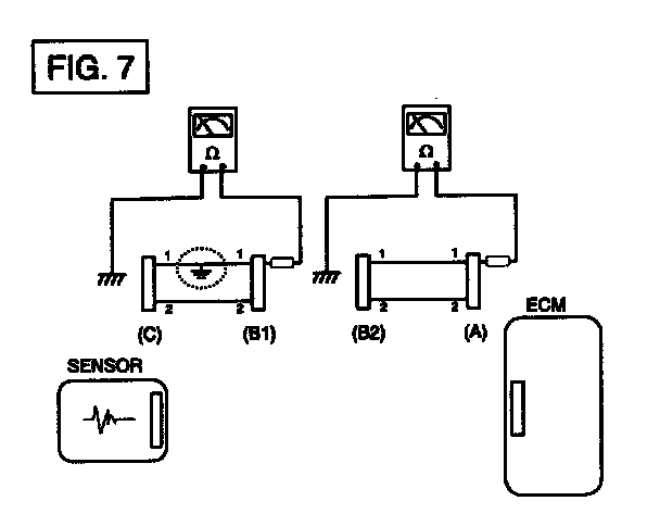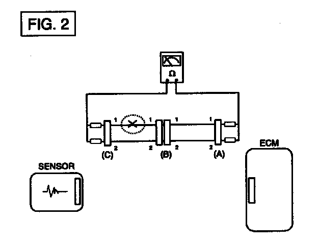 a. Disconnect connectors (A), (C) and measure for resistance between connector (A) and Chassis Ground as shown in (FIG. 6]. The measured resistance of line 1 and 2 in this example is below 1 ohm and higher than 1 Mohm respectively. Specifically the short to ground circuit is line 1 (Line 2 is normal). To find exact broken point, check the sub line of line 1 as described in the following step.