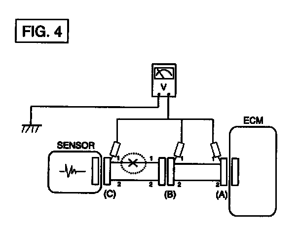a. With each connector still connected, measure the voltage between the chassis ground and terminal 1 of each connectors (A), (B) and (C) as shown in [FIG. 4].