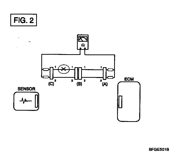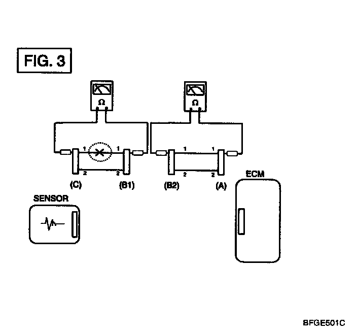 b. Disconnect connector (B), and measure for resistance between connector (C) and (B1) and between (B2) and (A) as shown in [FIG. 3].