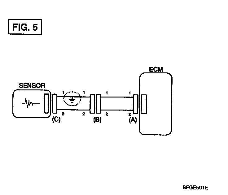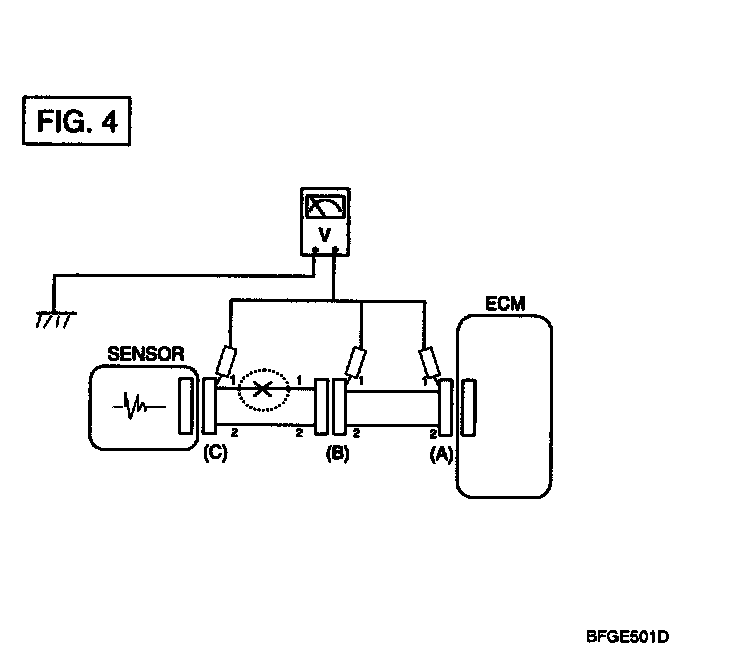 a. With each connector still connected, measure the voltage between the chassis ground and terminal 1 of each connectors (A), (B) and (C) as shown in [FIG. 4].