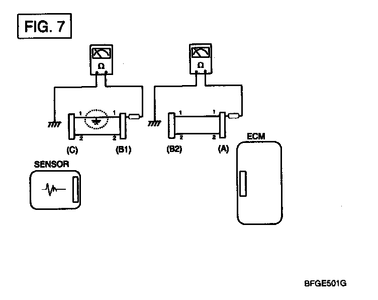 b. Disconnect connector (B), and measure the resistance between connector (A) and chassis ground, and between (B1) and chassis ground as shown in [FIG. 7].