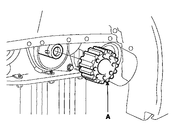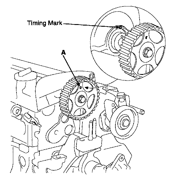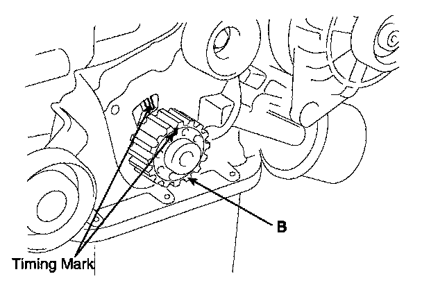 ^ Align the timing marks of the camshaft sprocket(A) and crankshaft sprocket(B) with the No.1 piston placed at top dead center and its compression stroke.